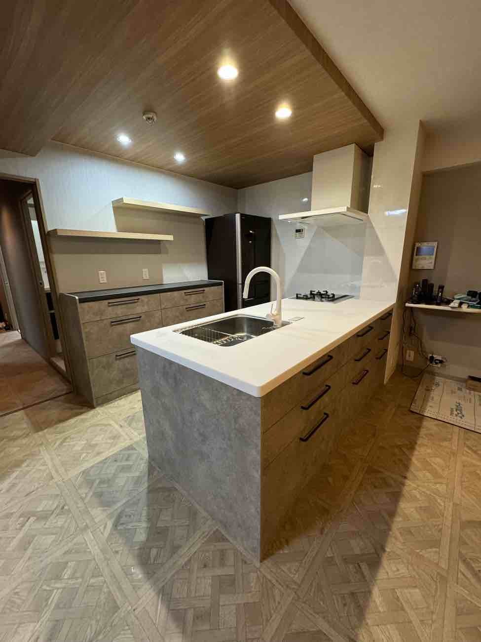 キッチン入口の壁を取り壊し、リビングとつながることで開放感をプラス。さらに、パイプスペースより内側に押し込まれていたキッチンを、外側ラインに合わせて新設し、希望だった“広いキッチンスペース”を実現しました。
