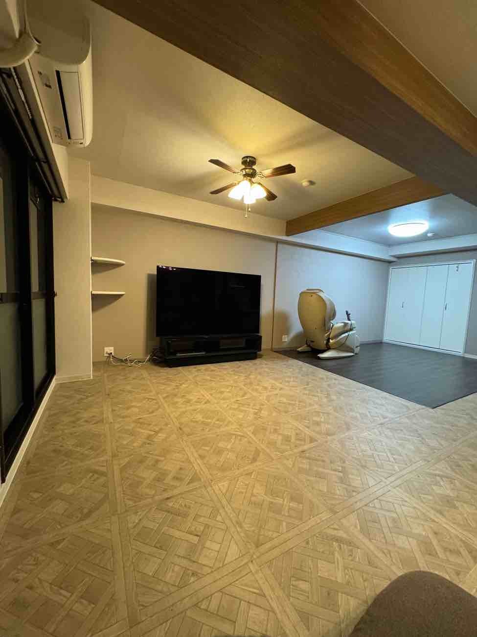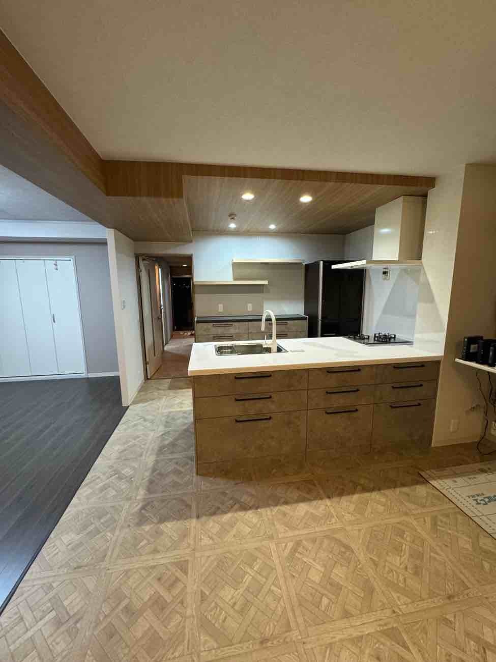 残す必要があった天井梁は、あえて木目調クロスを採用することで空間にメリハリを演出。リビング横の元寝室も一体空間に取り込み、床材の切り替えで緩やかなゾーニングを行うなど、暮らしやすさとデザイン性を両立したリノベーションとなりました。